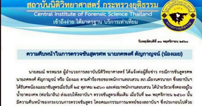 สถาบันนิติวิทยาศาสตร์ ยังไม่สรุปผลชันสูตรศพ ‘น้องเมย’ รอตรวจพิสูจน์อวัยวะภายใน ขอเวลาเจ้าหน้าที่ทำงานอย่างละเอียดรอบคอบตามมาตรฐาน