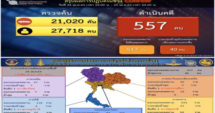 สำนักงานตำรวจแห่งชาติ สรุปจับกุมผู้ฝ่าฝืน รวมกลุ่ม มั่วสุม เสี่ยงต่อการแพร่เชื้อ ช่วงเคอร์ฟิว ระหว่างวันที่ 24 เม.ย.ต่อเนื่องเช้ามืดวันที่ 25 เม.ย.63 รวม 517 ราย