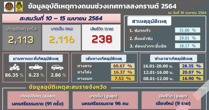 ศปถ.สรุปสถิติอุบัติเหตุทางถนน 10 – 15 เม.ย.เกิดอุบัติเหตุ 2,113 ครั้ง เสียชีวิต 238 ราย เจ็บ 2,116 คน ประสานจังหวัดเพิ่มความเข้มดูแลเส้นทางขากลับกทม. เส้นทางมุ่งจังหวัดใหญ่ เน้นตั้งจุดตรวจ เรียกตรวจถี่เส้นทางตรง