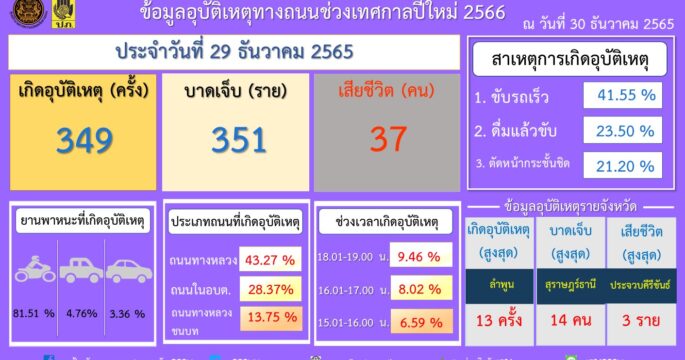 ศปถ. สรุปสถิติอุบัติเหตุทางถนน (29 ธ.ค.65) วันแรกของการรณรงค์ความปลอดภัยทางถนนช่วงปีใหม่ 2566 พบเกิดอุบัติเหตุ 349 ครั้ง บาดเจ็บ 351 คน เสียชีวิต 37 ราย ขณะที่ลำพูน เกิดอุบัติเหตุมากสุด 13 ครั้ง ด้านประจวบคีรีขันธ์ มีผู้เสียชีวิต 3 ราย