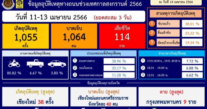 ศปถ. สรุปสถิติอุบัติเหตุทางถนนช่วงสงกรานต์ สะสม 3 วัน (11-13 เม.ย. 66) เกิดอุบัติเหตุรวม 1,055 ครั้ง ผู้เสียชีวิต 114 ราย ผู้บาดเจ็บ 1,064 คน กำชับจังหวัดเพิ่มจุดตรวจ-จุดสกัด กวดขันรถจักรยานยนต์ไม่ปลอดภัย กระบะเล่นน้ำ