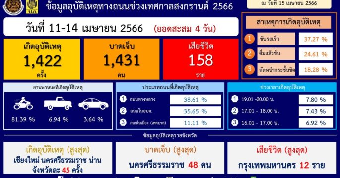 ศปถ.สรุปสถิติอุบัติเหตุสงกรานต์ 2566 สะสม 4 วัน (11-14 เม.ย.) เกิดอุบัติเหตุรวม 1,422 ครั้ง มีผู้เสียชีวิต 158 ราย บาดเจ็บ 1,431 คน กำชับจังหวัดปรับแผนการดำเนินงานตามบริบทในพื้นที่