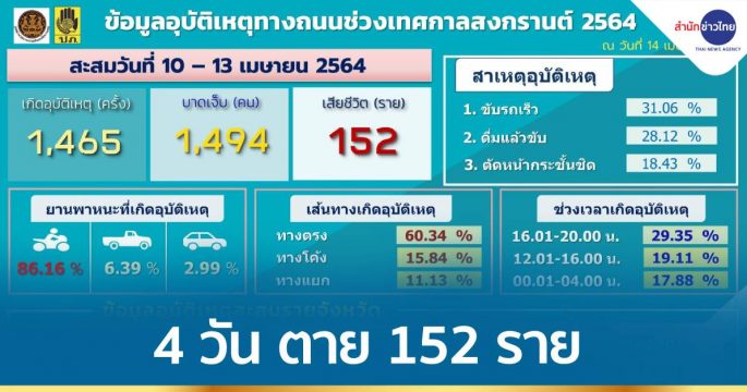 ศปถ.สรุปสถิติอุบัติเหตุ 4 วัน ตาย 152 ราย