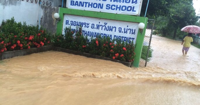 ผู้ว่าฯ น่านเตือนบ้านเรือนริมฝั่งย้ายทรัพย์สินไปที่ปลอดภัยก่อนล่วงหน้า ลำน้ำหลายสายน้ำขึ้นสูง หวั่นท่วมเพิ่มจากฝนยังตกต่อเนื่อง เอ่อท่วมแล้วชุมชนริมฝั่ง 3 อำเภอ โรงเรียนปิดชั่วคราว