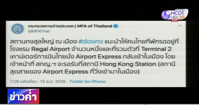 ยังไม่ยืนยันว่าวันพรุ่งนี้ตั้งแต่ 6 โมงเช้า ท่าอากาศยานนานาชาติฮ่องกงจะเปิดให้บริการได้หรือไม่ ล่าสุด สถานกงสุลใหญ่ฯ แจ้งให้คนไทยที่ติดค้างที่สนามบิน ให้ใช้รถไฟ Airport Express มาลงที่สถานี Hong Kong โดยจะมีเจ้าหน้าที่สถานกงสุลใหญ่ฯ รอช่วยเหลืออยู่