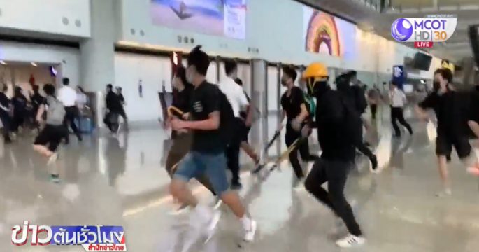 ตำรวจฮ่องกง วิ่งไล่จับผู้ประท้วงที่เข้าไปรวมตัวก่อหวอดในสนามบินฮ่องกง จนเกิดความวุ่นวาย ท่ามกลางการตรวจเข้มผู้โดยสารที่จะเข้าไปภายในสนามบิน