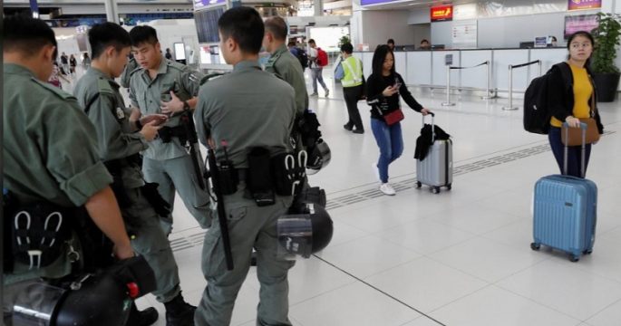 ตำรวจปราบจลาจลฮ่องกงเริ่มกระจายกำลังกันเข้าพื้นที่บริเวณสถานีรถไฟหลักที่ให้บริการไปยังท่าอากาศยานฮ่องกงในวันนี้ เพื่อป้องกันการประท้วงต่อต้านรัฐบาล