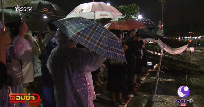 ประชาชนหลั่งไหลจับจองพื้นที่เพื่อเข้าร่วมพระราชพิธีถวายพระเพลิงพระบรมศพ แม้ช่วงค่ำมีฝนตกหนัก ก็ไม่เป็นอุปสรรค