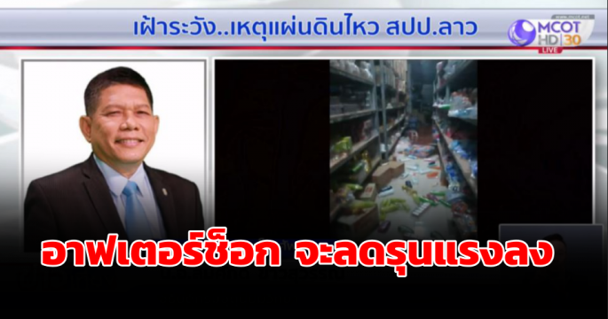 อธิบดีกรมอุตุฯ ชี้อาฟเตอร์ช็อกจากแผ่นดินไหวในลาวจะมีต่อเนื่อง แต่จะลดระดับความรุนแรงลงเรื่อยๆ และไม่มีความรุนแรงมากกว่าเมื่อช่วงเช้าที่ผ่านมาอีกแล้ว โดยแผ่นดินไหวครั้งนี้รอยเลื่อนในไทยที่ต้องเฝ้าระวัง คือ รอยเลื่อนปัว จ.น่าน แต่ยังไม่มีอะไรน่าห่วง