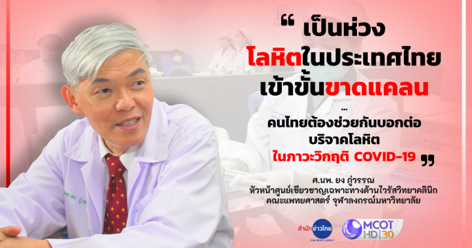 วิกฤตโควิด-19 ส่งผลบริจาคน้อย โลหิตสำรอง ไม่เพียงพอ กาชาดวอนคนไทยช่วยกัน ยืนยันมีมาตรการชัดเจน