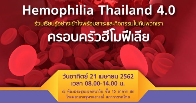 รพ.จุฬาฯ จัดงาน ‘Hemophilia Thailand 4.0’ 21 เม.ย.นี้ ให้ความรู้ความเข้าใจ เกี่ยวกับการดูแลรักษาผู้ป่วยโรคเลือดออกง่ายหยุดยากฮีโมฟีเลีย ซึ่งเป็นโรคหายาก