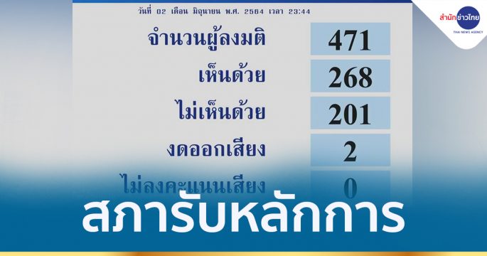 มติที่ประชุมสภาผู้แทนราษฎร รับหลักการร่าง พ.ร.บ.งบประมาณรายจ่ายปี 65 ด้วยคะแนน 269 ต่อ 201 เสียง พร้อมตั้ง กมธ. 2 คน