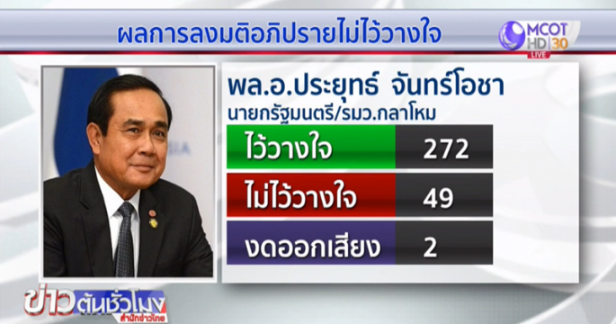 สภาผู้แทนราษฎร ลงมติไว้วางใจรัฐมนตรีทั้ง 6 คน โดยเป็นที่น่าสังเกตว่า นายกรัฐมนตรีและรัฐมนตรีเกือบทุกคนได้คะแนนไว้วางใจเท่ากัน ยกเว้น “พล.อ.ประวิตร” ที่ได้คะแนนมากที่สุด ขณะที่ “ร.อ.ธรรมนัส” ได้คะแนนน้อยที่สุด