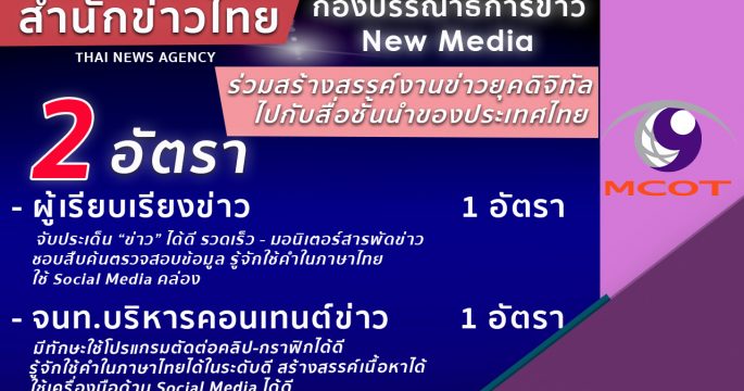 อสมท 1 ส.ค. 2560 – อยากให้มา! ถ้าคุณชอบงานข่าวในยุคดิจิทัล 😁 ✮ มาร่วมสร้างสรรค์งานข่าวยุคดิจิทัลไปกับสื่อชั้นนำของไทย ✮ บริษัท อสมท จำกัด (มหาชน) เปิดรับสมัครบุคคลเพื่อดำรงตำแหน่งต่างๆ ของกองบรรณาธิการข่าว New Media ฝ่ายบรรณาธิการข่าว สำนักข่าวไทย จำนวน 2 ตำแหน่ง เปิดรับสมัครตั้งแต่วันนี้ – อังคาร 18 สิงหาคม 2560 1.ผู้เรียบเรียงข่าว 1 ตำแหน่ง > https://goo.gl/QPBZwa2.เจ้าหน้าที่บริหารคอนเทนต์ข่าว 1 ตำแหน่ง > https://goo.gl/7dpvHb ดาวน์โหลดใบสมัครที่ www.mcot.net/category/ร่วมงานกับเรา สอบถามโทร 0-2201-6330 , 0-2201-6260 😉 – ทักษะที่จำเป็น – 1.ผู้เรียบเรียงข่าว (ทีมข่าวออนไลน์/Newsbar) -จับประเด็น “ข่าว” ได้ดี และรวดเร็ว […]