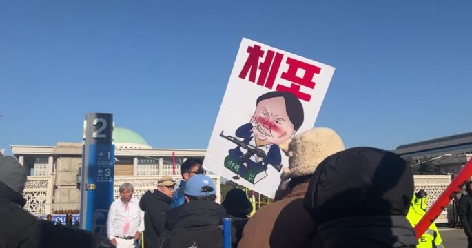 ผู้ประท้วงชาวเกาหลีใต้ชุมนุมกันที่บริเวณด้านนอกอาคารสมัขขาแห่งชาติในช่วงเช้าวันนี้ ก่อนหน้าที่สมาชิกรัฐสภาจะพิจารณาลงมติในวันนี้