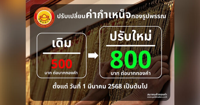สมาคมค้าทองคำ เตรียมปรับขึ้นค่ากำเหน็จทองรูปพรรณ จาก 500 บาท เป็น 800 บาท เริ่ม 1 มี.ค.68 หลังไม่ได้ปรับมา 10 ปี ชี้ต้นทุนค้าทองคำสูงขึ้น