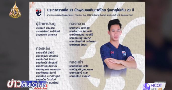สมาคมกีฬาฟุตบอลแห่งประเทศไทย ประกาศรายชื่อฟุตบอลชายทีมชาติไทยรุ่นอายุไม่เกิน 23 ปี ทั้งหมด 23 คน สำหรับการแข่งขันฟุตบอลรายการ “เมอร์ไลออน คัพ 2019” ที่ประเทศ สิงคโปร์ ระหว่างวันที่ 5-10 มิถุนายน 2562