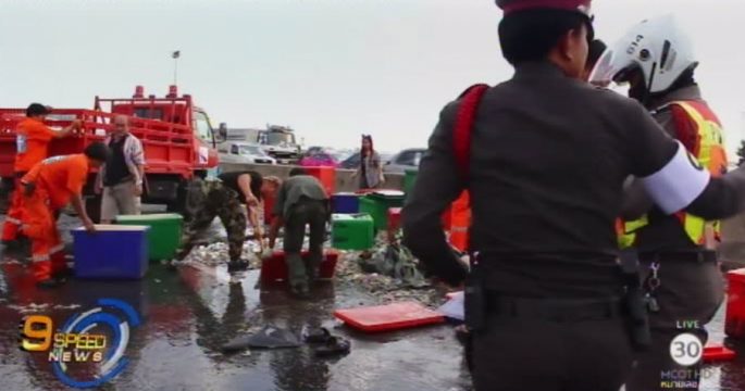 รถกระบะบรรทุกกุ้งสดจากตลาดมหาชัย-สมุทสาคร เต็มคันรถ เพื่อไปส่งที่ตลาดปากน้ำ-สมุทรปราการ เกิดเหตุยางรถยนต์ระเบิด ทำให้พลิกคว่ำเทกระจาดกุ้งสด 4,000 กิโลกรัม กลางถนน