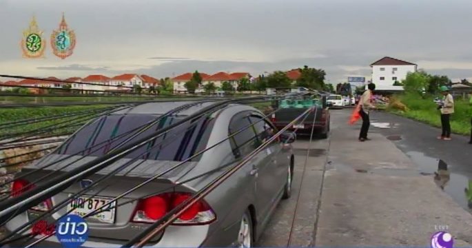 พายุฝนและลมพัดเสาไฟแรงสูงล้ม 30 ต้น เป็นระยะทางกว่า 1 กม. รถยนต์เสียหาย 30 คัน จักรยานยนต์ 2 คัน บาดเจ็บอีก 1 ราย คาดไฟดับทั้งคืน เดือดร้อนหลายพันครัวเรือน