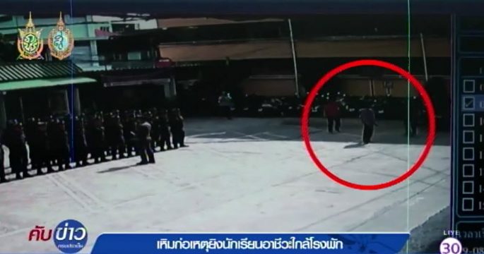 นักเรียนช่างกล ถูกลูกตำรวจเก่าขี่รถจักรยานยนต์มาจอดชักปืนกระหน่ำยิงหมดโม่ กระสุนเข้าเหยื่อ 2 นัด หนีตายเข้าใต้ถุนศาลาประชาคม ส่วนผู้ก่อเหตุถูกล็อคตัวทันควัน