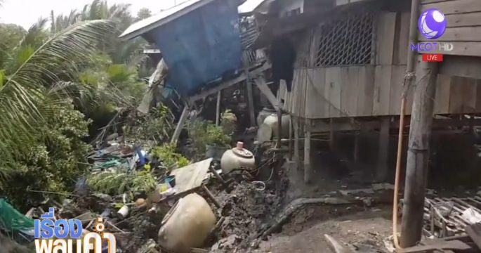 ฝนตกดินอุ้มน้ำ รับน้ำหนักบ้านไม่ไหว สุดท้ายทรุดพังลงคลองเสียหายเกือบทั้งหลัง ไม่มีใครได้รับบาดเจ็บ
