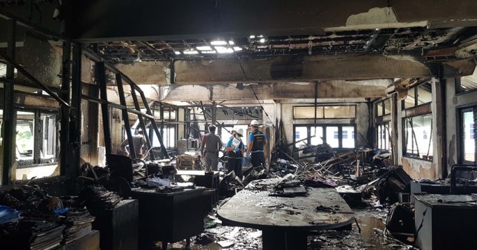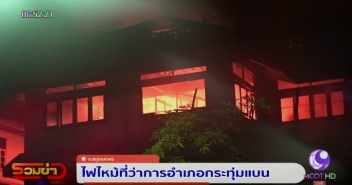 ฟไหม้ที่ว่าการอำเภอกระทุ่มแบน เจ้าหน้าที่ระดมฉีดน้ำใช้เวลานานเกือบ 1 ชั่วโมง เพลิงจึงสงบ สาเหตุคาดไฟฟ้าลัดวงจร