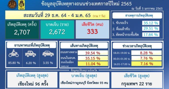 ศปถ.สรุปอุบัติเหตุทางถนน 29 ธ.ค.64 – 4 ม.ค.65 รวม 2,707 ครั้ง เสียชีวิต 333 ราย เจ็บ 2,672 คน เชียงใหม่ครองแชมป์ตลอด 7 วัน ขณะกทม.ตายสะสมสูงสุด บูรณาการหน่วยเกี่ยวข้องถอดบทเรียนลดตายให้เหลือ 12 คน ต่อประชากรหนึ่งแสนภายในปี 70