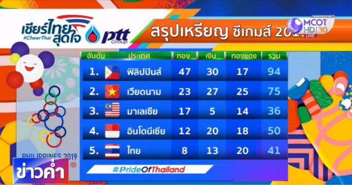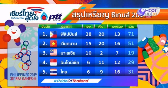 สรุปเหรียญทองซีเกมส์ 2019 ประเทศ ทอง เงิน ทองแดง รวม 1.ฟิลิปปินส์ 68 49 36 153 2.อินโดนีเซีย 32 38 41 111 3.เวียดนาม 31 38 41 110 4.สิงคโปร์ 26 19 27 72 5.มาเลเซีย 23 16 26 65 6.ไทย 17 24 34 75 โปรแกรมกีฬาที่น่าสนใจของนักกีฬาไทย ในช่วงบ่าย 13.00 น.วอลเลย์บอลชายหาดชาย 13.15 น. ฮอกกี้น้ำแข็ง 13.00 น. วอลเลย์บอลชายในร่ม 14.00 น. มวย 15.00 น.สนุกเกอร์ […]