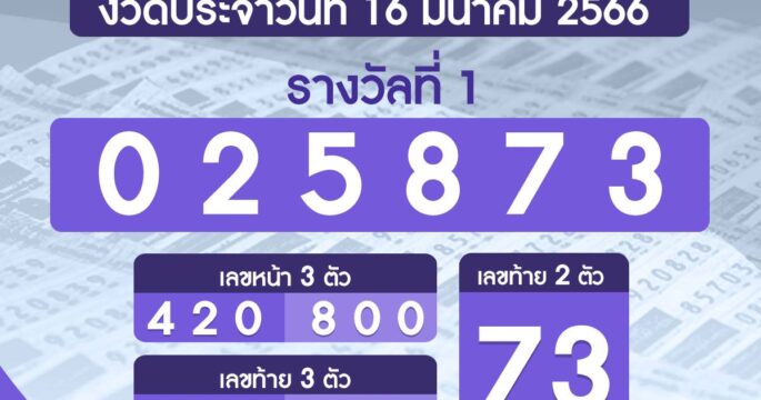ผลรางวัลสลากกินแบ่งรัฐบาล งวดวันที่ 16 มีนาคม 2566