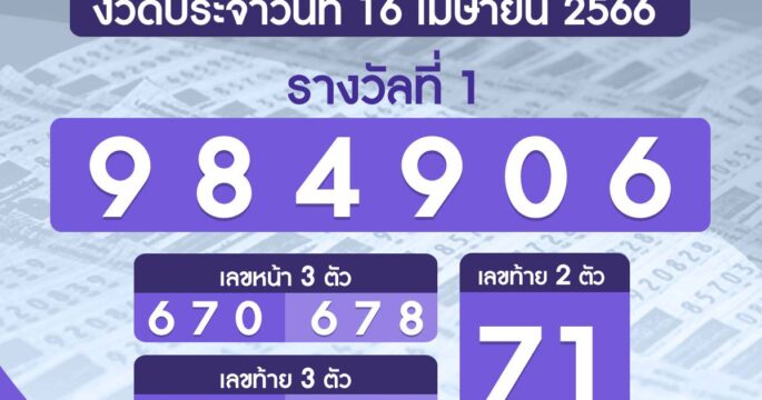ผลรางวัลสลากกินแบ่งรัฐบาล งวดวันที่ 16 เมษายน 2566