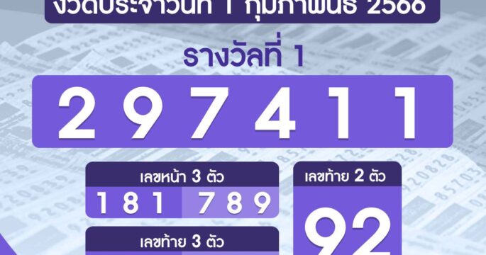 ผลรางวัลสลากกินแบ่งรัฐบาล งวดวันที่ 1 กุมภาพันธ์ 2566