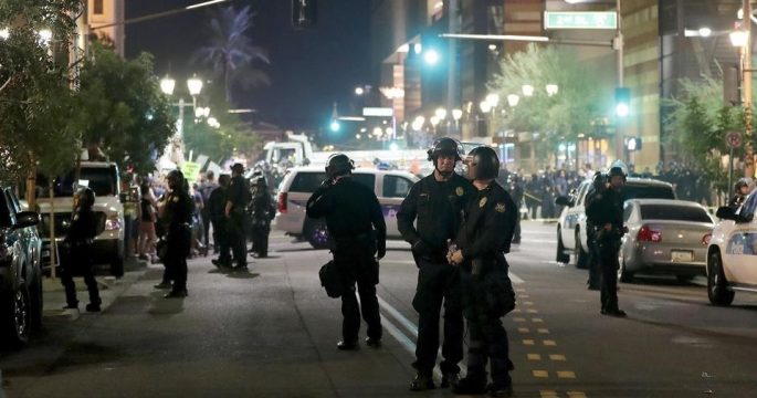 ตำรวจใช้แก๊สเข้าสลายฝูงชนที่เมืองฟีนิกซ์ รัฐแอริโซนา ภายหลังมีกลุ่มผู้ประท้วงที่ด้านหน้าที่ชุมนุมประธานาธิบดีโดนัลด์ ทรัมป์ ผู้นำสหรัฐ