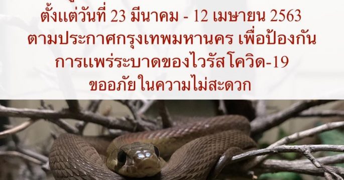 กทม.23 มี.ค.-สวนงู สถานเสาวภา ปิดทำการชั่วคราว ตั้งแต่วันนี้ ถึง 12 เม.ย.63 ตามประกาศ กทม.เพื่อป้องกันการแพร่ระบาดของเชื้อโควิด-19 ขออภัยในความไม่สะดวก