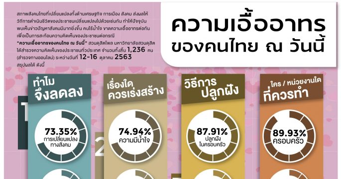 สวนดุสิตโพล สำรวจความคิดเห็นของประชาชนเรื่อง “ความเอื้ออาทรของคนไทย ณ วันนี้” กลุ่มตัวอย่าง 1,236 คน สำรวจระหว่างวันที่ 12 – 16 ตุลาคม 2563 พบว่าสาเหตุที่ความเอื้ออาทรของคนไทยลดลง เพราะการเปลี่ยนแปลงทางสังคม