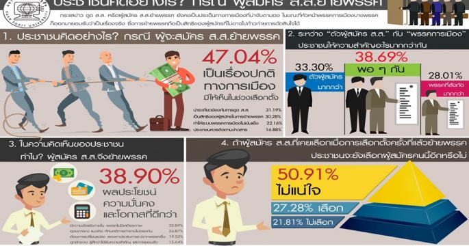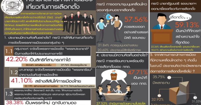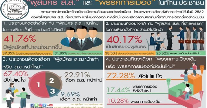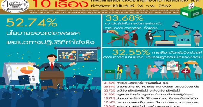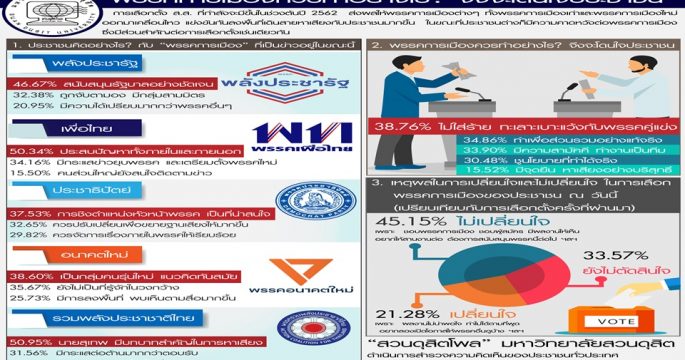“สวนดุสิตโพล” มหาวิทยาลัยสวนดุสิต ได้สำรวจความคิดเห็นของประชาชนผู้มีสิทธิเลือกตั้งทั่วประเทศ หัวข้อ “บัตรเลือกตั้งแบบไหน? ที่ผู้ใช้สิทธิเลือกตั้งต้องการ” จำนวนทั้งสิ้น 1,139 คน ระหว่างวันที่ 12-15 ธันวาคม 2561 หลังมีกระแสข่าวเรื่องบัตรเลือกตั้ง ส.ส. กรณี ข้อเสนอตัดโลโก้และชื่อพรรคการเมืองออกจากบัตรเลือกตั้ง พบว่า ร้อยละ 40.55 เห็นว่า บัตรเลือกตั้งที่เป็นแบบมีแต่เบอร์ ไม่มีโลโก้และชื่อพรรค ทำให้สับสน จำชื่อและหมายเลขพรรคไม่ได้ ร้อยละ 24.62 เห็นว่า อาจเกิดการทุจริต โกงเลือกตั้งได้ง่าย และร้อยละ 20.74 เห็นว่า ไม่เป็นมาตรฐาน ไม่เป็นสากล เมื่อถามว่า ประชาชนอยากให้บัตรเลือกตั้ง ในวันที่ 24 ก.พ.62 นี้ เป็นอย่างไร ร้อยละ 48.13 บอกว่า อยากให้มีชื่อผู้สมัคร โลโก้ ชื่อพรรคครบถ้วน ชัดเจน ร้อยละ 22.70 บอกว่า อยากให้กระดาษดี สีสด ตัวหนังสือชัด […]