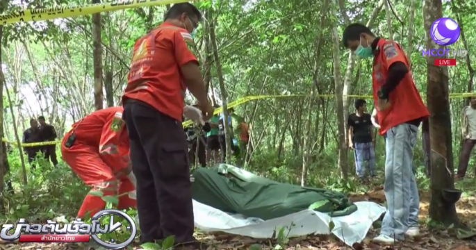 ตำรวจตรวจสอบเหตุคนถูกฆ่าฝังดินในสวนยางพาราบ้านตาเซะใต้ อ.สุไหงปาดี จ.นราธิวาส พบลำคอมีเข็มขัดทหารพรานมัดไว้ มือทั้ง 2 ข้างถูกมัดด้วยเชือกไนลอน มีร่องรอยถูกกระสุนปืนบริเวณหน้าอก 1 นัด