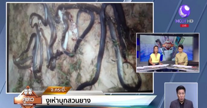 ชาวบ้านกระบี่จ้างรถไถปรับพื้นที่และดันหมอนไม้ริมสวนยาง ใบมีดรถไถฟันถูกงูเห่าอาศัยอยู่รวมกันในกองไม้เป็นจำนวนมาก พบซากงูเห่าตายมากถึง 19 ตัว
