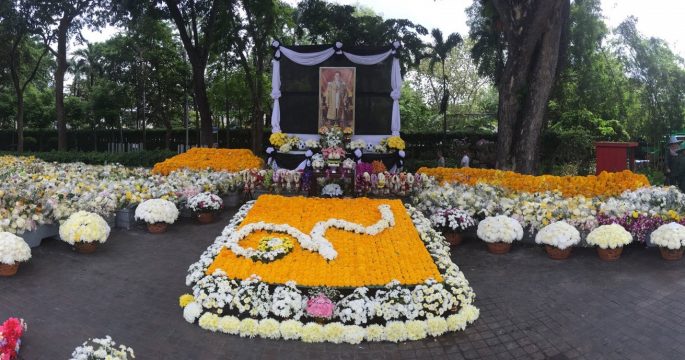 กทม.นำดอกไม้ที่ประชาชนนำมาแสดงความอาลัยรอบพระบรมมหาราชวัง จัดวางแต่งสวนภายในสวนสราญรมย์