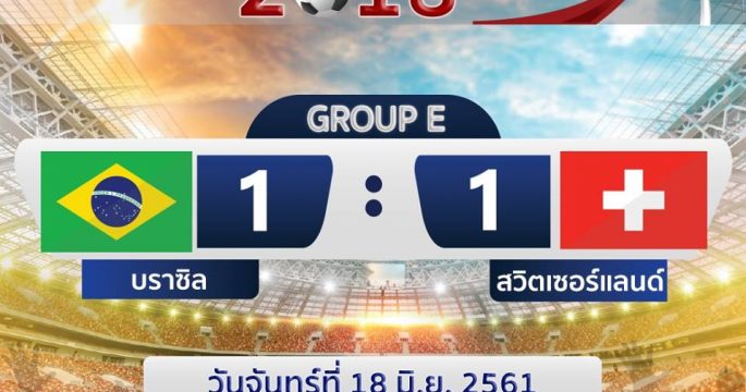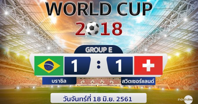 ผลฟุตบอลโลก 2018 กลุ่มอี บราซิล พบ สวิตเซอร์แลนด์ โดย “แซมบ้า” จัดชุดใหญ่ ทั้งเนย์มาร์, วิลเลี่ยน และฟิลิปเป้ คูตินโญ ในนาทีที่ 20 บราซิลได้ประตูขึ้นนำจากฟิลิปเป้ คูตินโญ จากจังหวะยิงไกลนอกกรอบเขตโทษ บอลพุ่งเบียดเสาไกลเข้าประตูไปอย่างงดงาม แต่จากนั้นนาทีที่ 50 สตีเวน ซูเบอร์ ขึ้นโหม่งจากลูกเตะมุมเข้าประตูไป จบเกมเสมอกัน 1-1 แบ่งกันทีมละ 1 คะแนน