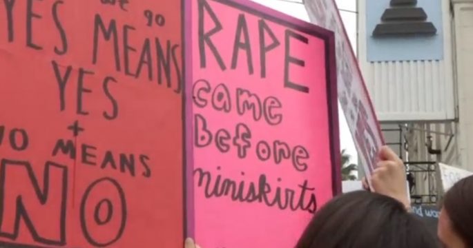 ประชาชนหลายร้อยคนเดินขบวนในใจกลางย่านฮอลลีวูดนครลอสแอนเจลิสของสหรัฐ เพื่อแสดงพลังสนับสนุนเหยื่อข่มขืนและล่วงละเมิดทางเพศ