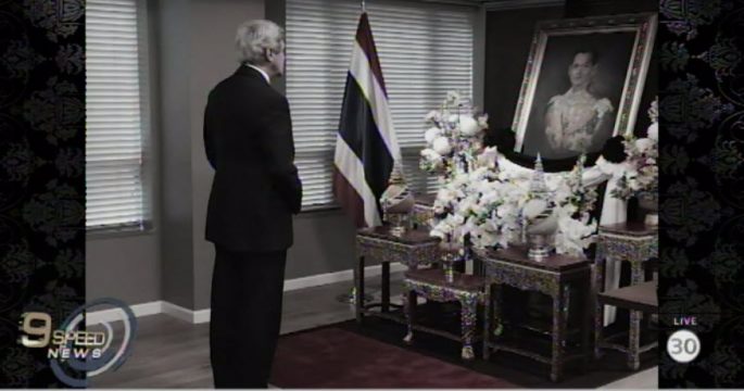 พสกนิกรชาวไทยในเมืองบอสตัน สหรัฐอเมริกา รวมกันวางช่อดอกไม้ถวายสักการะ พระบาทสมเด็จพระปรมินทรมหาภูมิพลอดุลยเดช ณ จัตุรัสภูมิพลอดุลยเดช ด้วยความอาลัยยิ่ง
