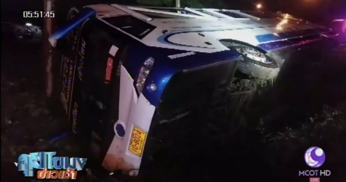 รถทัวร์นครราชสีมา-เชียงใหม่ ขับฝ่าสายฝน ถึงสี่แยกไฟแดงเบรกกะทันหัน รถหมุนเสียหลักพลิกคว่ำตกลงข้างทาง ผู้โดยสารเจ็บนับสิบราย