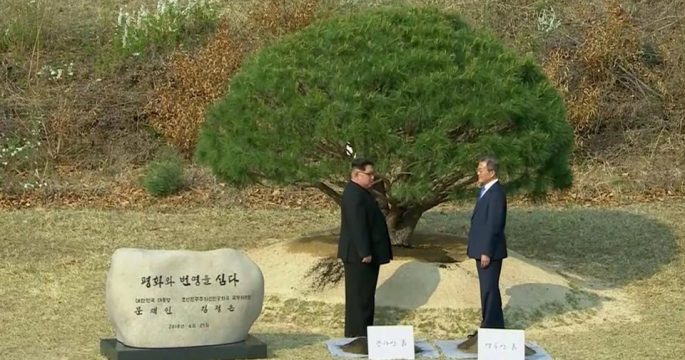 นายคิม จองอึน ผู้นำเกาหลีเหนือและประธานาธิบดีมุน แจอินแห่งเกาหลีใต้ร่วมปลูกต้นสนที่บริเวณพรมแดนระหว่างประเทศทั้งสองที่มีการรักษาความปลอดภัยอย่างแน่นหนาในวันนี้