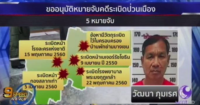 หลังศาลอาญา ออกหมายจับนายวัฒนา ภุมเรศ อายุ 62 ปี รวม 5 หมาย กรณีพบพยานหลักฐานเชื่อมโยงเหตุระเบิดหลายพื้นที่ตั้งแต่ปี 50 รวมถึงที่โรงพยาบาลพระมงกุฏเกล้า