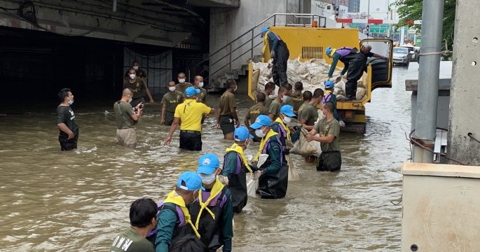 กองพลที่ 1 รักษาพระองค์ ร่วม สนง.เขตบางพลัด วางกระสอบทราย ช่วยประชาชนชุมชนสะพานกรุงธน หลังน้ำทะเลหนุนสูง