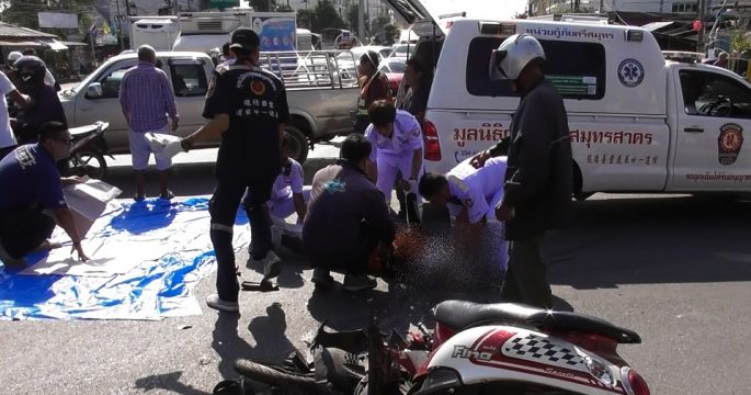 ตำรวจค้นวงจรปิดหาที่มาอุบัติเหตุบนถนนสะพานมหาชัย เมืองสมุทรสาคร พบรถสองแถวแล่นชิดเบียด จยย.ขณะแม่พาลูกไปส่งโรงเรียนเจ็บหนักทั้งคู่ สุดท้ายแม่เสียชีวิต คุมตัวคนขับสองแถวสอบปากคำ