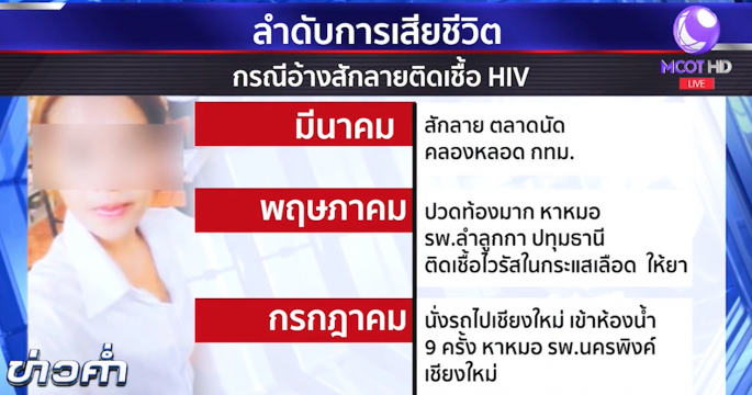 ผอ.ศูนย์วิจัยโรคเอดส์ สภากาชาดไทย ชี้ผู้ติดเชื้อเอชไอวีอย่างเฉียบพลัน อาการจะแสดงออกได้ภายใน 3-4 สัปดาห์ แต่ไม่ถึงกับเสียชีวิต ทำให้คาดว่าสาเหตุการเสียชีวิตของสาวเลยไม่น่าจะเกี่ยวข้องกับการสักลาย