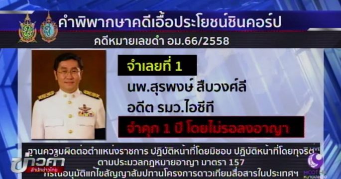 ศาลฎีกาแผนกคดีอาญาของผู้ดำรงตำแหน่งทางการเมือง ตัดสินจำคุก 1 ปี นพ.สุรพงษ์ สืบวงศ์ลี อดีตรัฐมนตรีไอซีที โดยไม่รอลงอาญา คดีแก้ไขสัญญาเอื้อประโยชน์ให้กับบริษัทในเครือชินวัตร