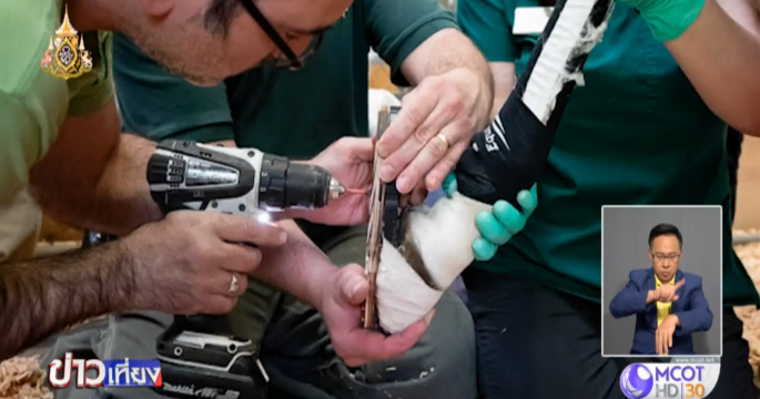 สัตวแพทย์นำเฝือกสวมขาลูกยีราฟแรกเกิด เพื่อให้เดินได้ดีขึ้นจากเหตุกระดูกขาโก่ง-คาดใช้เวลาหลายเดือนในการรักษา