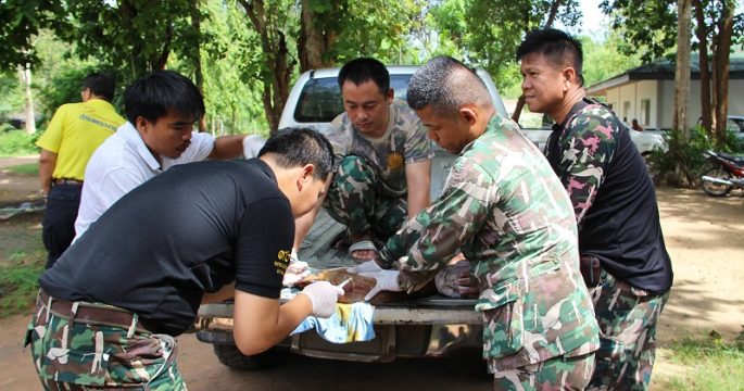 สัตวแพทย์ผ่าพิสูจน์ซากลูกหมีป่า หลังชุดลาดตระเวนเขตรักษาพันธุ์สัตว์ป่าดงใหญ่-บุรีรัมย์ บนนตายอยู่ริมห้วย พบในกระเพาะอาหารมีผักหนามจำนวนมาก คาดสาเหตุสารโนจิไกลโคโซด์ในผักดิบ